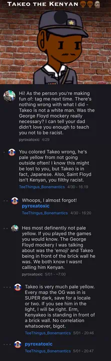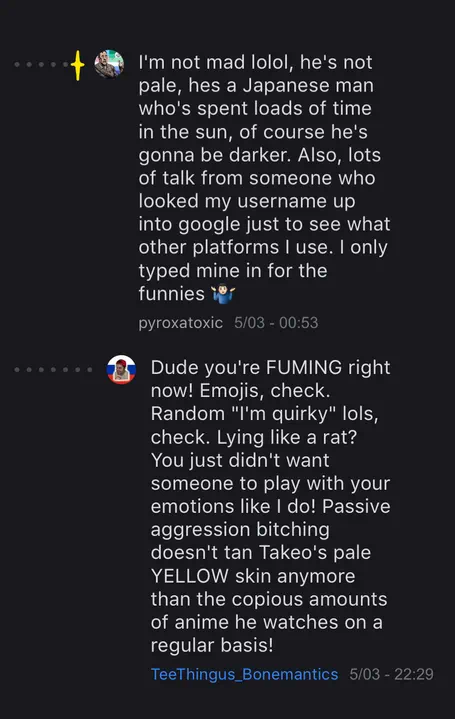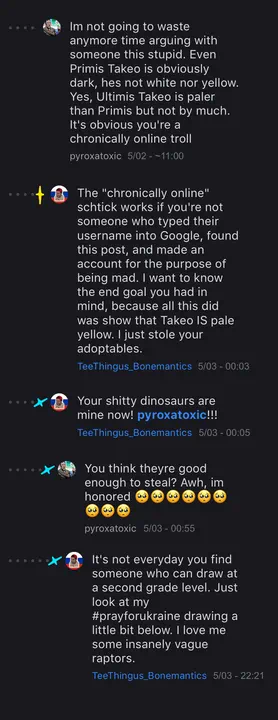 Here's the photos of the conversation I had saved and edited to make more readable to everyone. The blue star marks an offshoot thread to the main thread (yellow star). These were supposed to be posted on iF when I made it, but proved too unpredictable and Automod autogunted them.