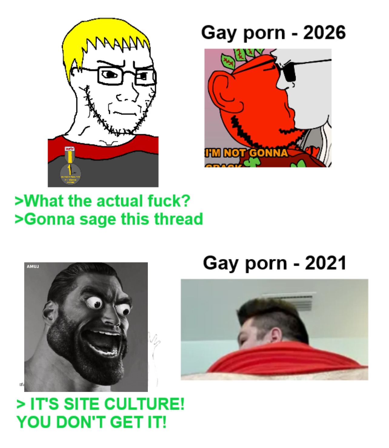 TeeThingus Bonemantics about 19 hours ago [hidden] ChrisCrossGriffin said:Dude did you just admit an picture of a man's anus is funny?In the same sense that Goatse was funny. Edits of him and certain clips of him are funny too. 4 Reply Copy ID Copy Link